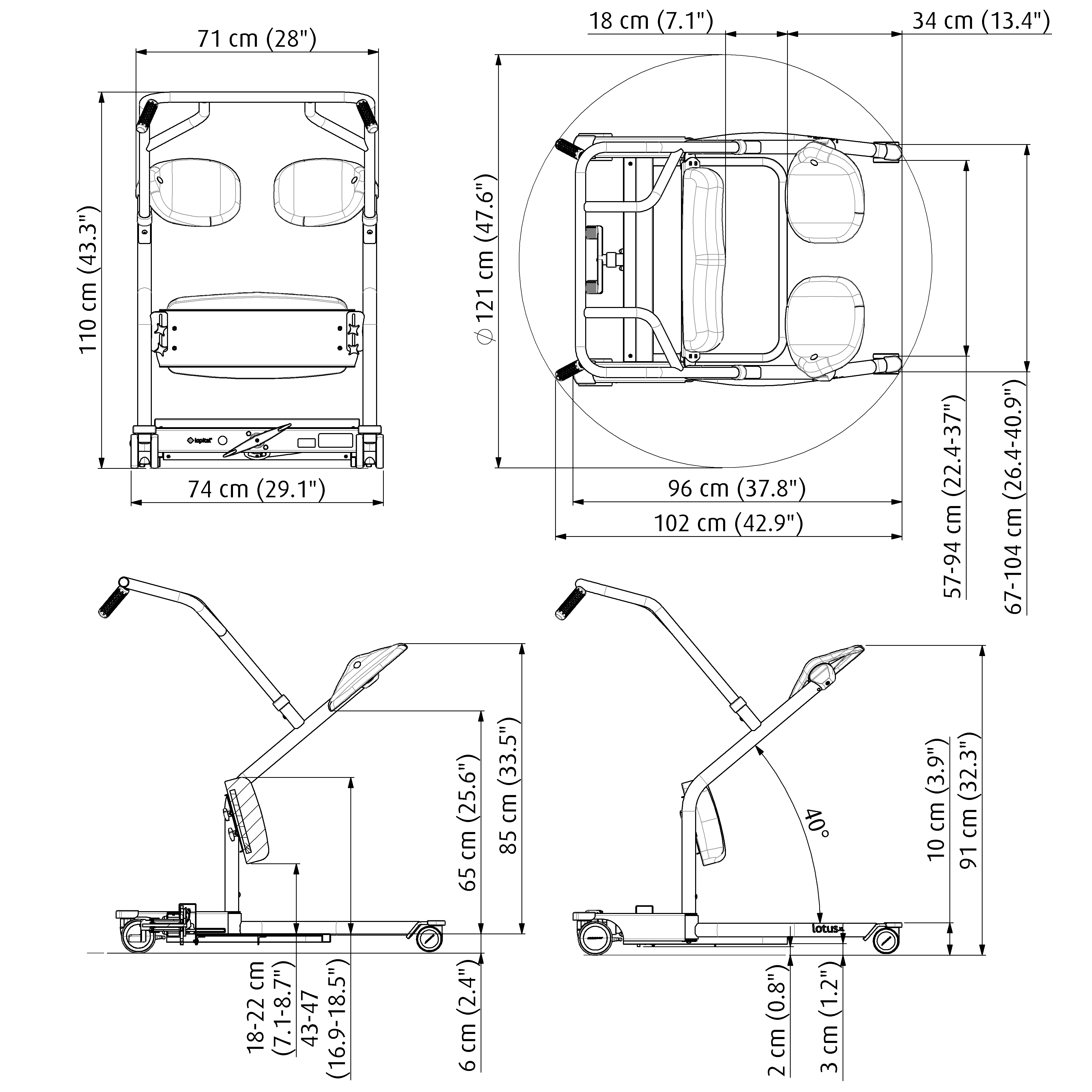 De Lotus en Lotus XL zijn ontworpen voor gebruikers met een gemiddelde lengte tussen 1.70 m en 1.95 m.